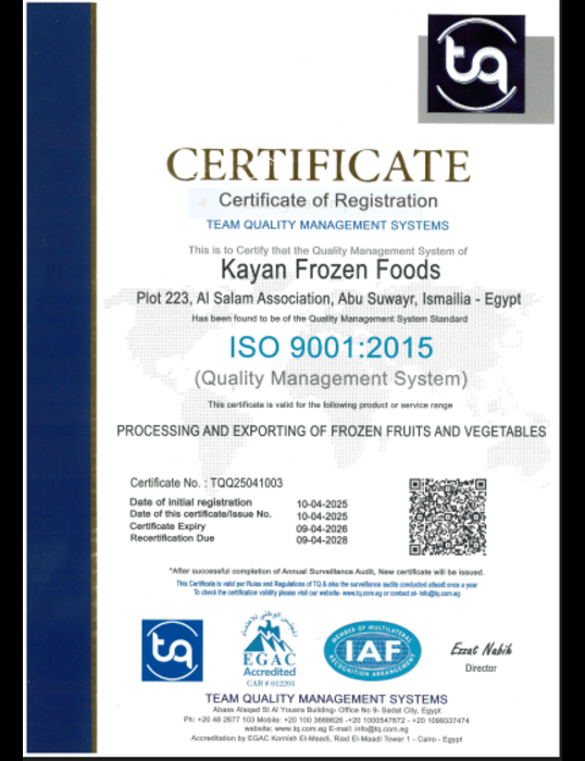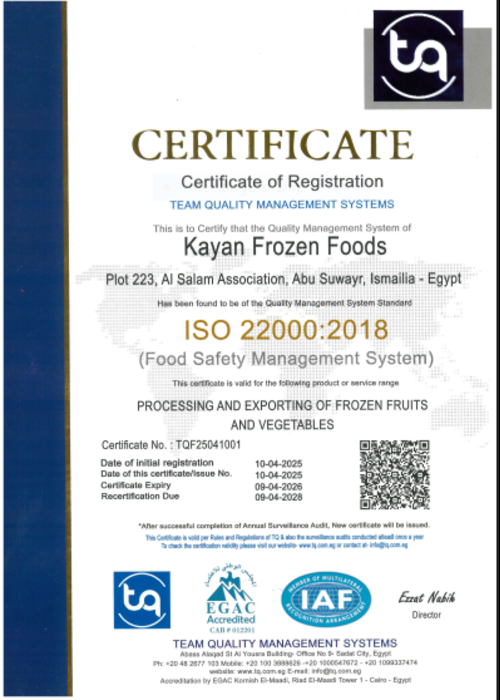 في "كيان" للأغذية المجمدة، نضع الجودة في صميم كل ما نقوم به. نحرص على اتباع أعلى المعايير في جميع مراحل الإنتاج بداية من اختيار المواد الخام وحتى التعبئة والتغليف، لضمان تقديم منتجات آمنة وصحية ترضي تطلعات عملائنا. وقد تم اعتماد مصنعنا من جهات رقابية معتمدة، بعد اجتيازنا لعدد من الفحوصات والاختبارات التي تؤكد التزامنا الصارم بمعايير السلامة الغذائية والجودة. نحن نعمل بشكل دائم على تطوير أنظمتنا ومتابعة أحدث الممارسات لضمان الحفاظ على الثقة التي وضعها عملاؤنا في منتجات "كيان".